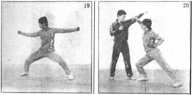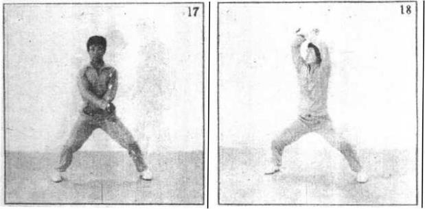 5 劈臂两拳在腹前交叉左拳在里右拳在外(图17)。两臂上举(图18)。分拳向两侧直臂平劈拳眼朝上(图19)。以拳、小臂劈击头、肩等部位。
