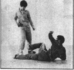 2 乙一脚勾甲右脚跟一脚蹬甲小腿把甲摔向后倒(图873)。
