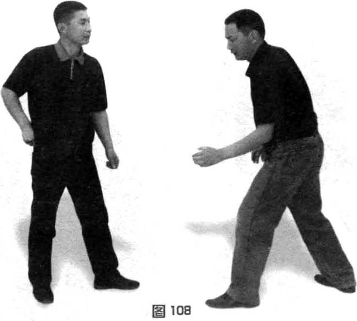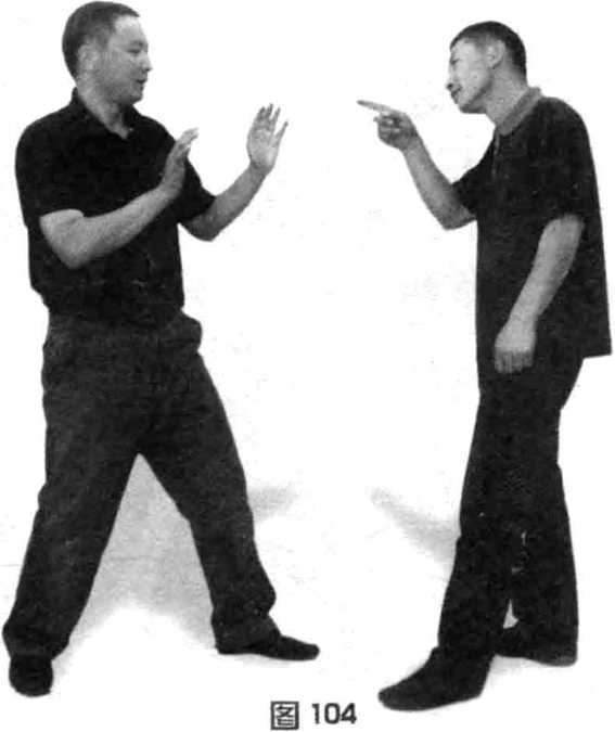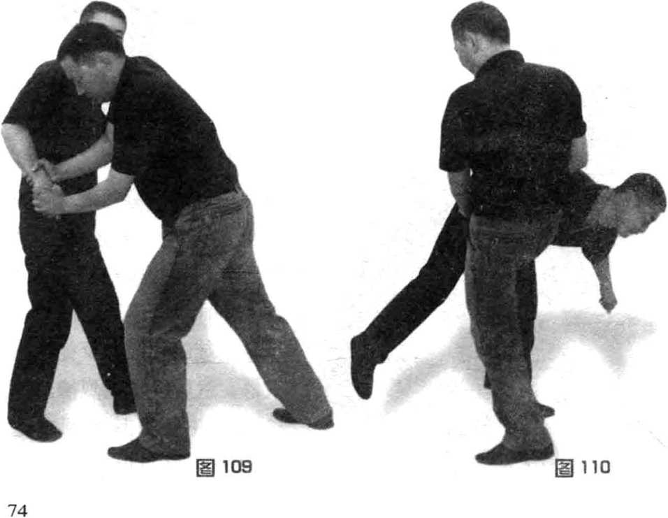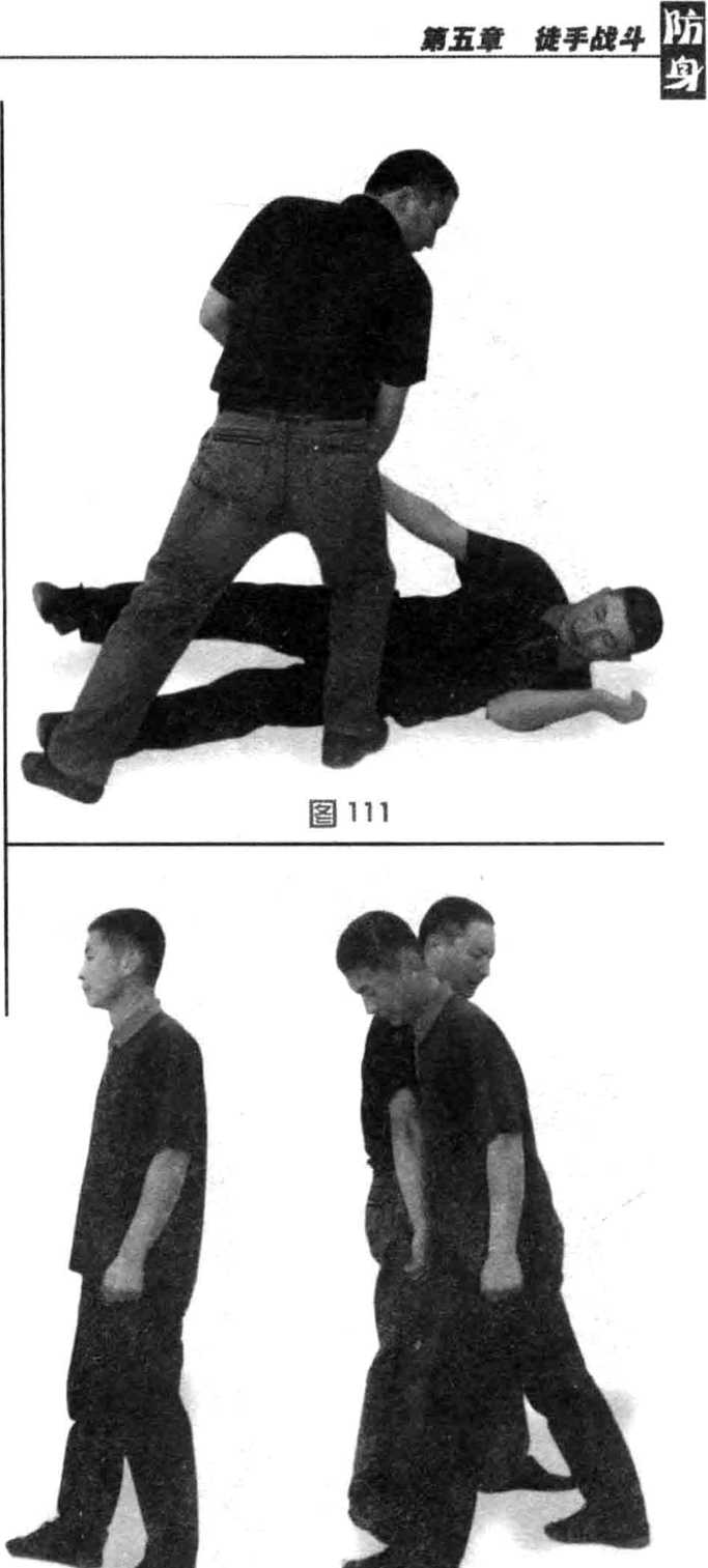 圄106圄106圄107圄1073 我与歹徒发生争执,我上举双手以避免使歹徒感到威胁。歹徒威胁要教训我然后欲从衣兜里掏出武器。此时我应迅速前冲并且抓住歹徒的手阻止歹徒掏出武器。然后用膝猛烈撞击歹徒裆部并且将其摔倒在地(图108?图111)。