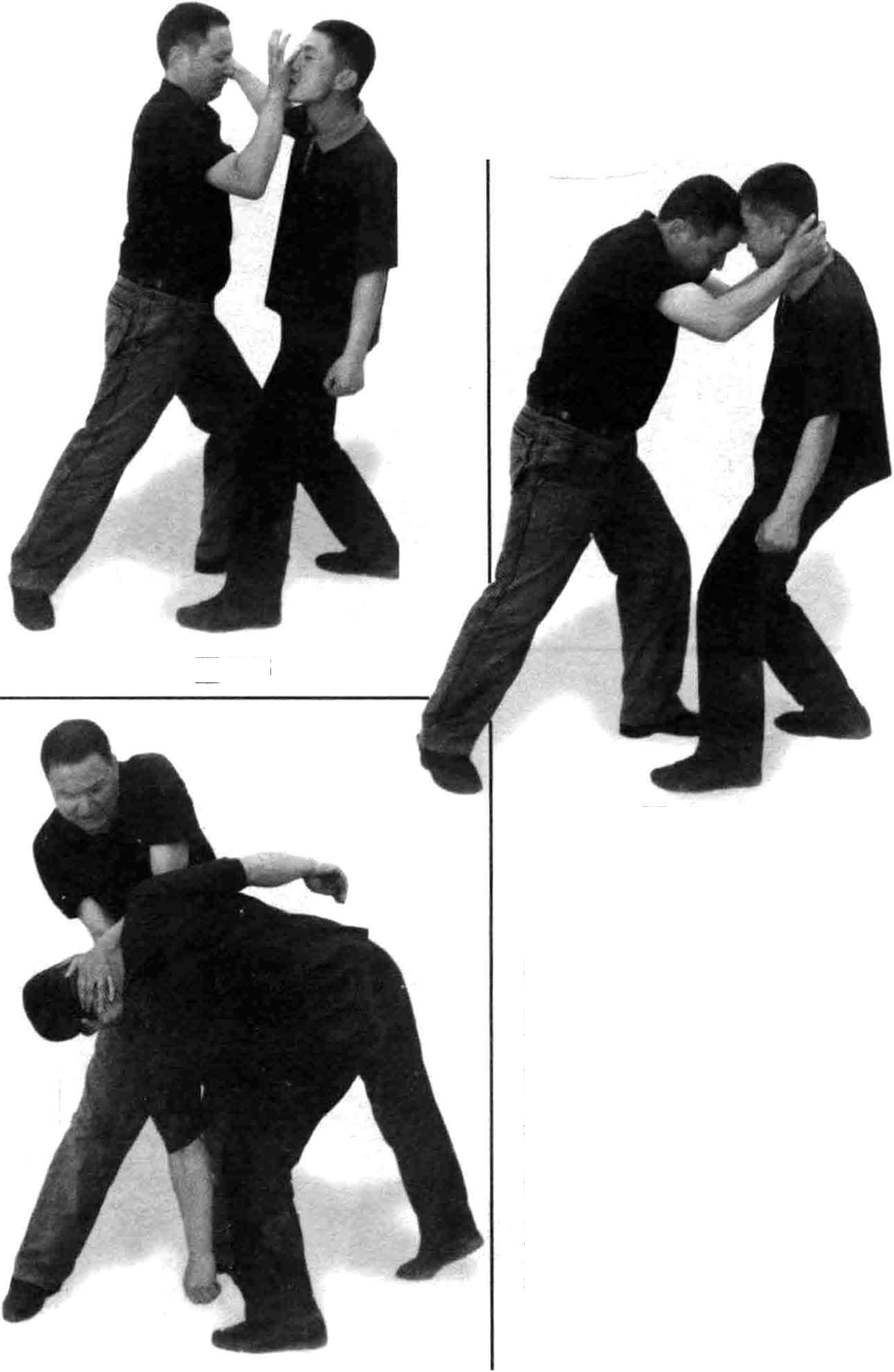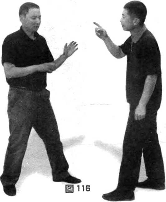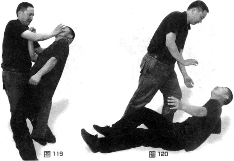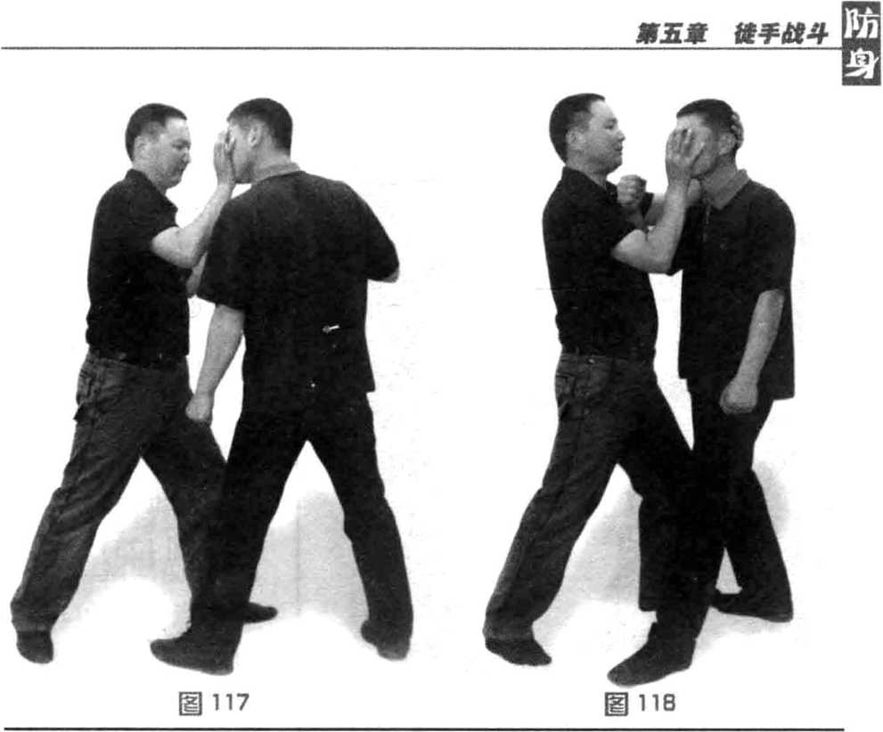 4 我与歹徒发生争执歹徒威胁我我突然前冲以右手抵住歹徒眼部遮挡其视线左手掌置于其脑后然后抓住其头猛烈摇晃并且向下按住歹徒下颌当歹徒失去平衡时我以左腿将其绊倒然后脱离现场(图116?图120)。