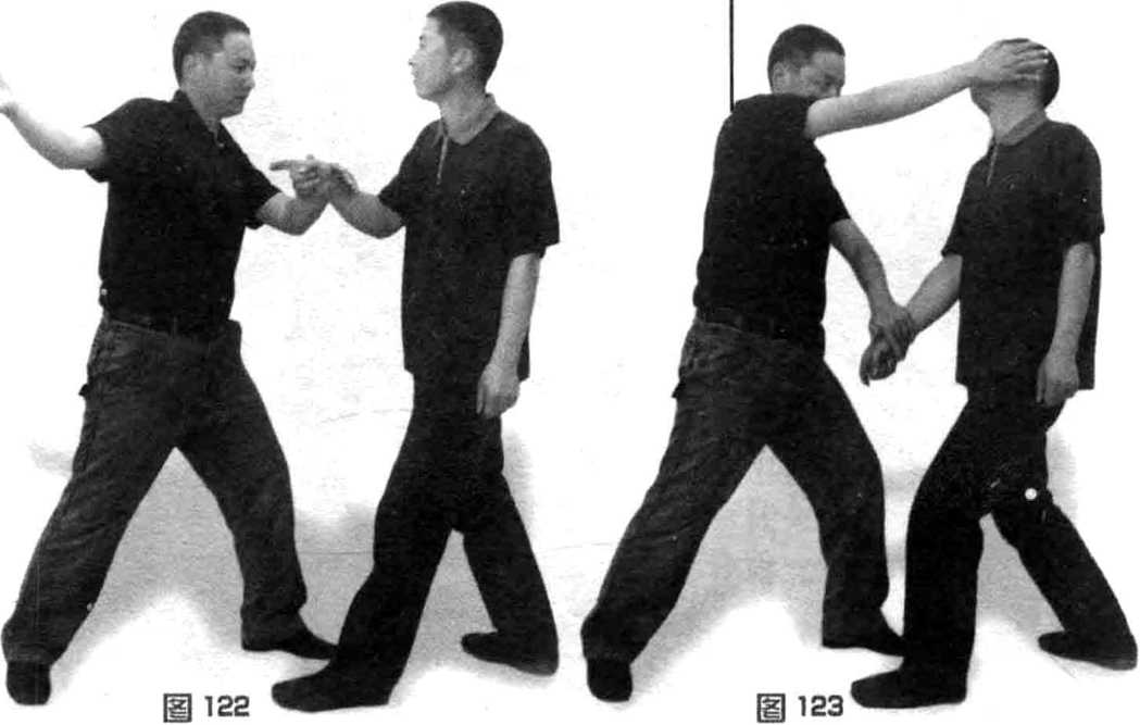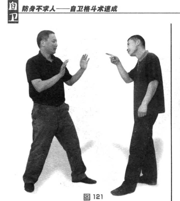 我抬起双手以避免使歹徒感到威胁。歹徒进一步逼近我放低右手移到他的视线之外我用左手抓住歹徒的右手并用右耳光击中他的脸(图121?图123)。