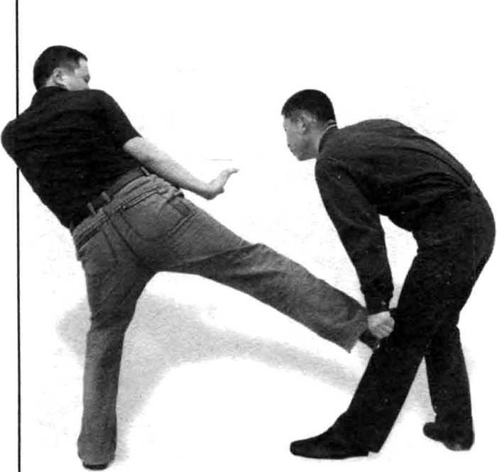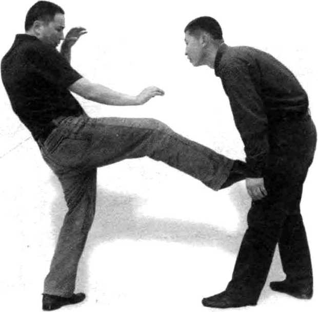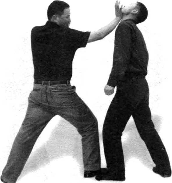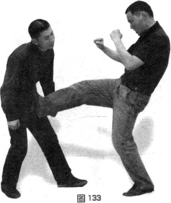 圄124圄1247歹徒展开攻势威胁我我向前迈步忽然以右侧踹攻击歹徒前腿膝关节,歹徒中招向前俯身,我再以右底掌猛推歹徒下巴(图124、图125)
