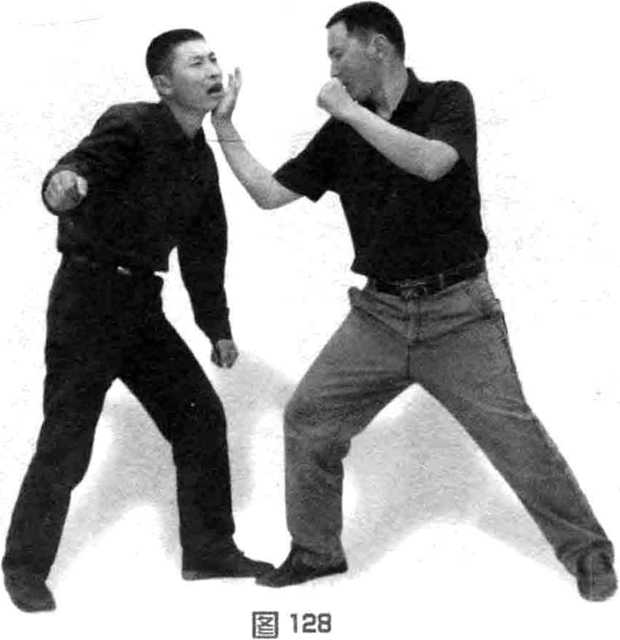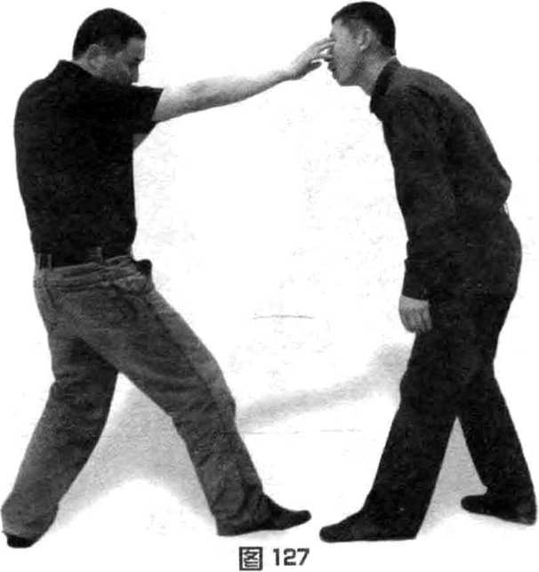歹徒威胁我我突然前冲我先以右脚弹踢歹徒裆部歹徒收腹躲闪我落右脚同时以右手指戳击歹徒眼睛(图126、图127)。