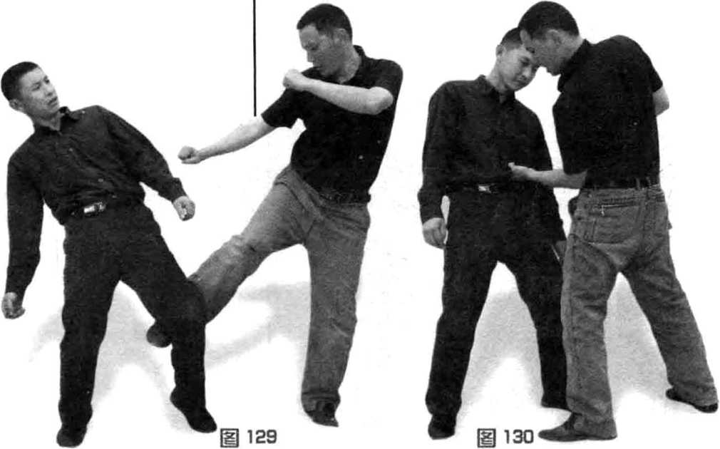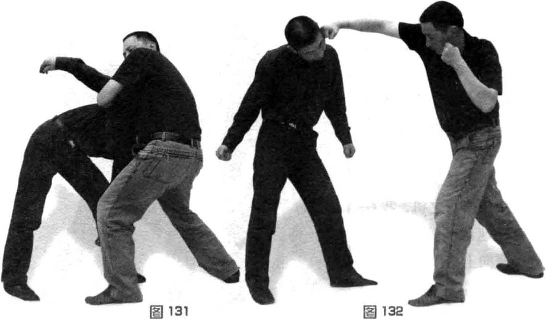 9我与歹徒发生争执歹徒欲逼近攻击我我以语言分散歹徒注意力。我忽然以右底掌攻击歹徒下巴接着以右扫踢攻击歹徒左膝窝落右步以左上勾拳猛击歹徒腹部趁歹徒中招俯身之机我右臂迅速绕压歹徒喉部,快速向上施压同时把敌头向左右两方挤压、扭动(图128?图131)。