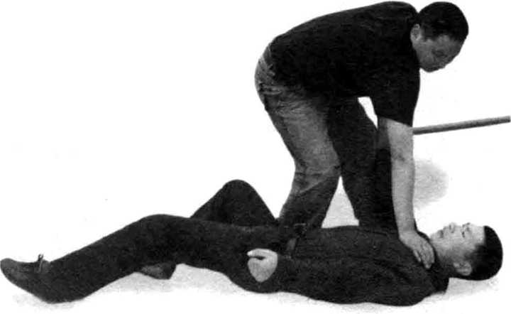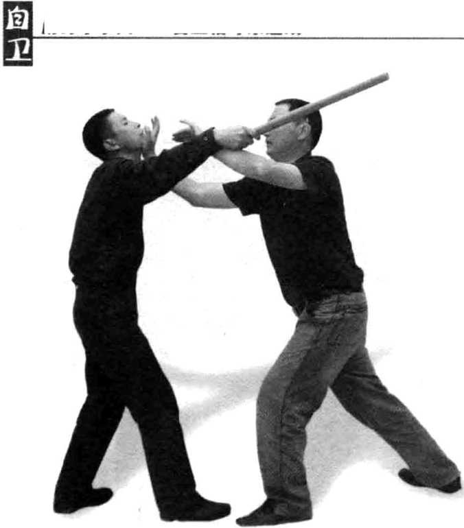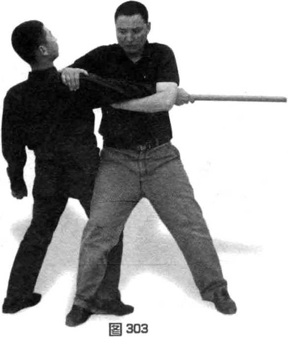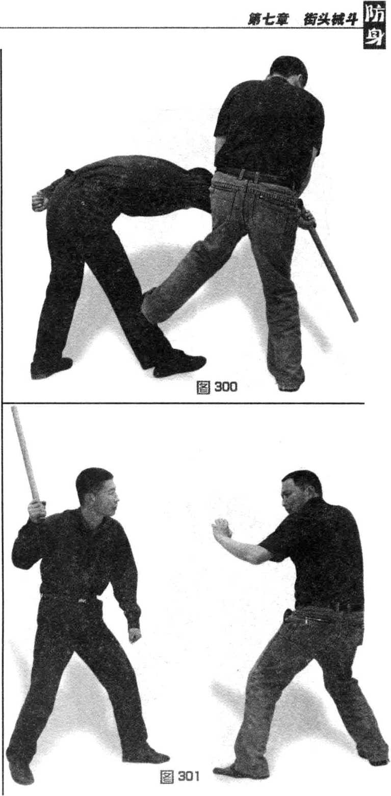双手将敌手腕拧转紧接着以左脚猛力踩踏敌右膝关节制服歹徒(图299、图300)。5 我与持棍歹徒打斗歹徒举棍自上而下砸击我迅速切入以左手臂封阻然后以掌根猛击歹徒下颌。接着用左手臂卷扭住歹徒右手臂将右腿跨到歹徒右腿后别扫同时以右手击打其肩部将歹徒摔倒在地(图301?图304)302圄3046 我与持棍歹徒打斗
