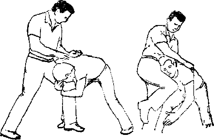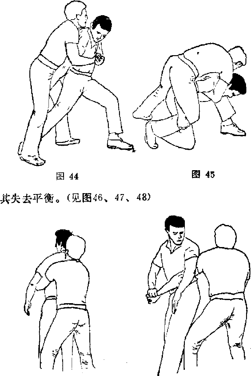 当对方在自卫者身后从其双臂腋下抱住时自卫者用右手抓住对方左腕用力向下翻卷}以撬开对方的抱握随后向外侧转身迫使对方被抓手臂放在自已的左臀下用左蜀抵在对方外展的胳膊上并向下用力迫使图46图46图47图47图46图46图47图47图48(六)抱腿的解脱1抱单腿的解脱。当对方抱住自卫者的一条腿时自卫若可将体重压图49图49图30图30图49图49图30图30在被抱的腿上另一腿先向后或侧方向移动燃后空熟屈膝上括攻击对方的面部口(见图49、50)
