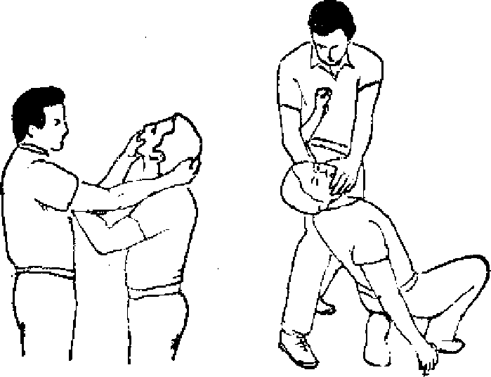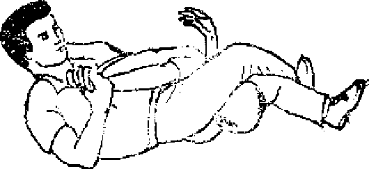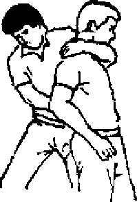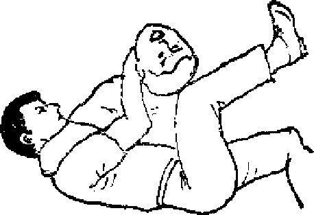 如果自卫者处于被摔倒的状态那么常常需要用脚来抗击。这时自卫者可将没有被压住的手和脚举起来同时用手去抬起对方的下颌随即用扣住那个向上突出的颌这时对方的身体必然向后仰倒然后用力值制住对方僵接近自卫者的手臂腿部用力下压(见图96、97