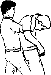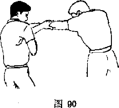当对方双手正面突然抓自卫旁的前胸时自卫者用右手绕过对方的肩膀抓住其头后部的头发与此同时抬起左手用掌心托住对方的下巴双手抓稳后就用右手向自己方向拉动左手朝对方方向推去这一扭动可对其颈根部造成损伤(见图88、89)