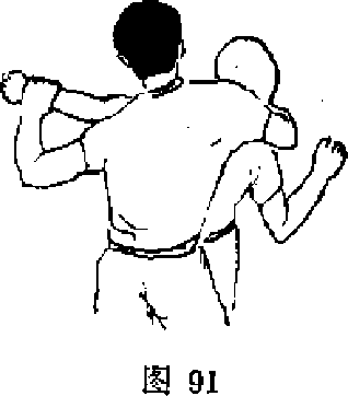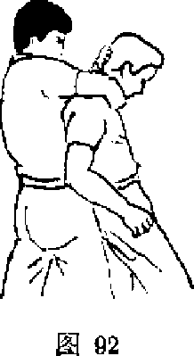 另外在防守住对方左拳攻击而侧闪身于对方身后后可用右手锁住其喉部并用左手按压其后脑部双手扣住挺甑梃腹。(见图92)也可在闪身到对方身后而乘其未转身之机双手播腋下锁肩上伸双掌按压其颈部造成对方颈部疼痛难忍(见图93)