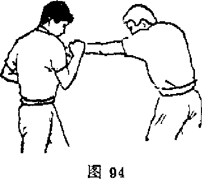 在对方发左拳攻击自卫者时也可以用右手来防守进行搂压对方左手臂同时退速上右脚闪于对方身倒并用左臂锁其喉部右手按其腰部使其后仰(见图钏、95)