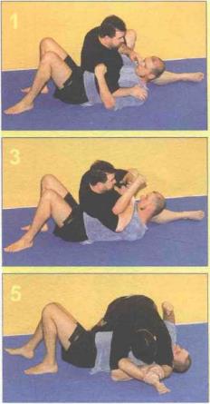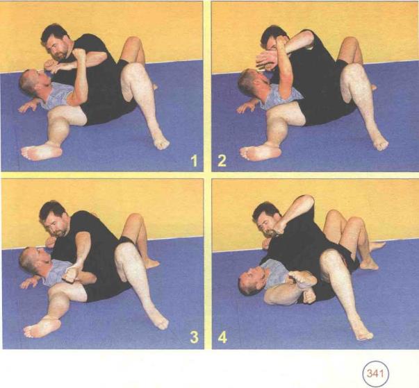 5 用双臂将的手臂向下按到地上并改变为交叉位置(侧骑乘式)。的左手肘牢牢地压着的脖子左侧。尽可能向后推自己的身体重新调配自己的体重用力推压的上身右侧。将自己的臀部朝下推向地面。