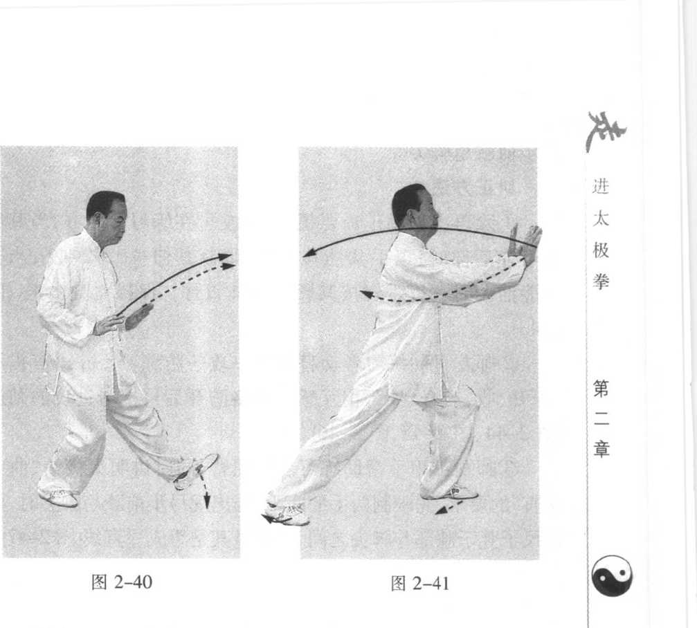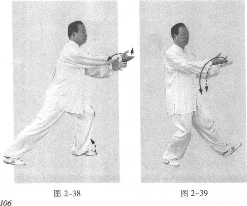 分开,距离不超过肩宽,注意两臂应弧线下落;前按掌也要走 弧形,并与弓步腿协调一致,后坐和前弓均要立身中正,不可 前俯凸臀或后仰。