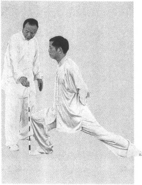 ③师友可用手帮助练习者略屈臂,同时讲明太极拳“曲中 求直”的要求,并限制两手的间距。当出现弓步前膝趋脚尖时,可 ?用尺子竖于膝部与脚尖之间,以衡量其是否成一直线(图2-47)。