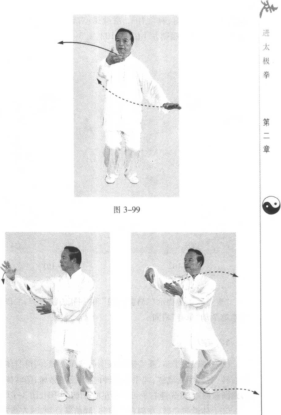 ⑴上体向右转,重心移至右腿,左脚收至右脚内侧,脚前 掌点地;同时右手随之向右运转,至右侧方时变成勾手、腕高 同耳平;左手经腹前向右上划孤至右肩前,手心向内。眼随右 手(图 3-99、图 3-100、图 3-101)。