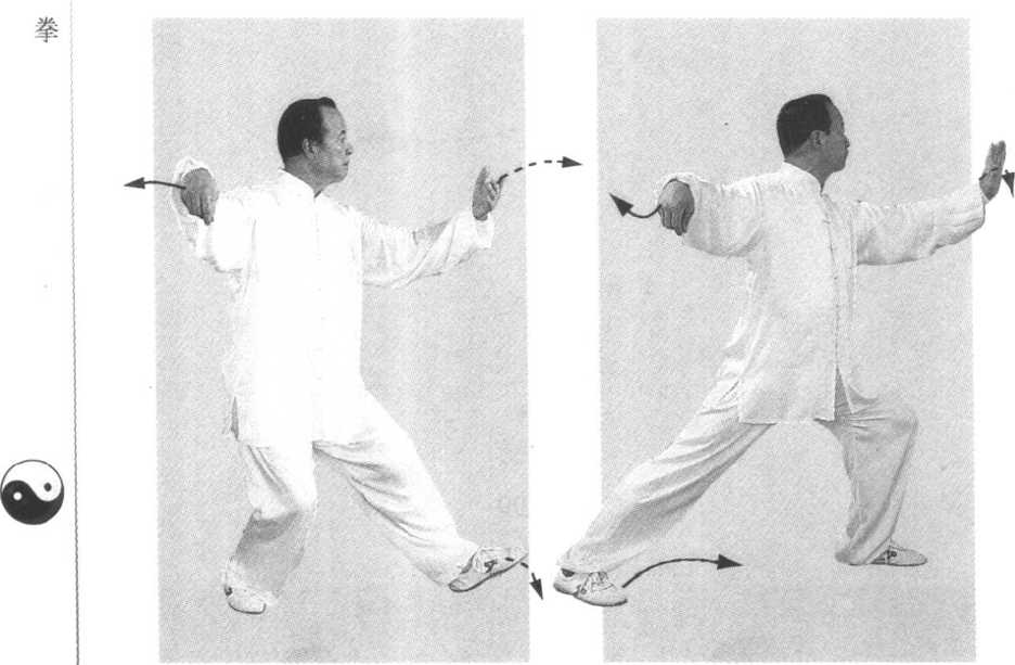 ⑵上体微向左转,随之左脚向左前方迈出,脚跟着地,随 即全脚掌踏实,左腿屈膝前弓,右腿自然伸直,右腿跟碾转后 蹬成左弓步;在重心左移的同时,上体继续左转,左掌翻转向 792