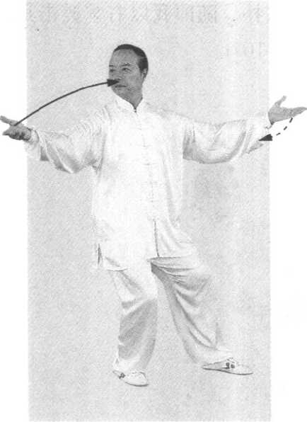⑶师友可在定势时,轻按练习者右肘,令其微屈;另在其 侧方限制左肘过分后收,或在肘腰之间插进一个拳头,并提示 需虚腋。