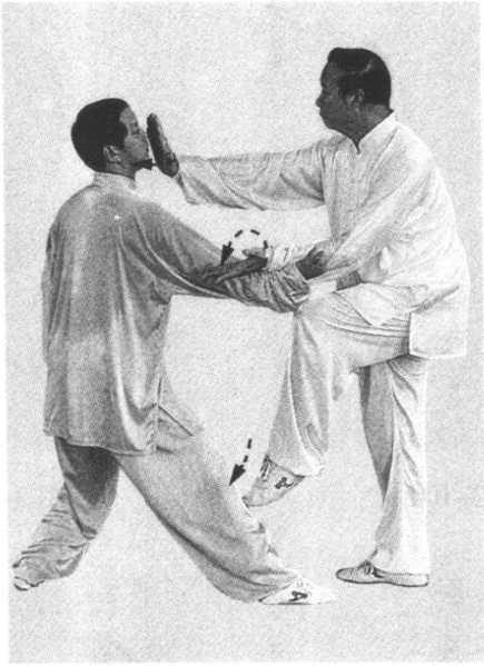 进 太 极 拳进 太 极 拳?收腰侧,用后拳带之劲使对手前扑。随即我以右掌搓击其面 部,同时左脚踢其小腿胫骨(图3-107)o