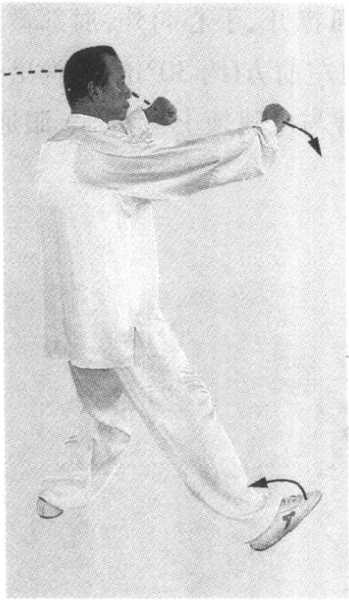(3)两掌分别向左前、右后划弧撑开,手心向外,肘部微屈, 进 腕与肩平;同时左脚屈膝提起,向左前方(约30。)慢慢蹬出,脚 尖回勾,力达脚跟,高度过腰,左臂与左腿须上下相对。眼通过