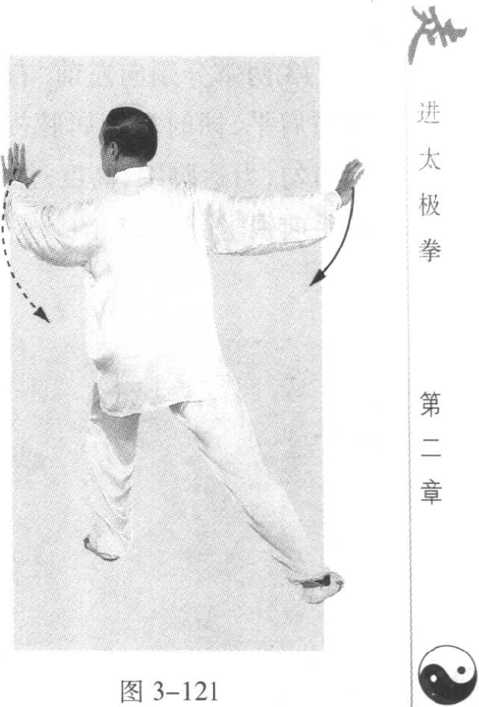 ⑴左腿屈膝后坐,重心移至左腿,上体向左转,右脚尖里 扣;同时两拳变掌,由上向左前、右后划弧分开平举,手心向 前。眼随左手(图3-120.图3-121)。