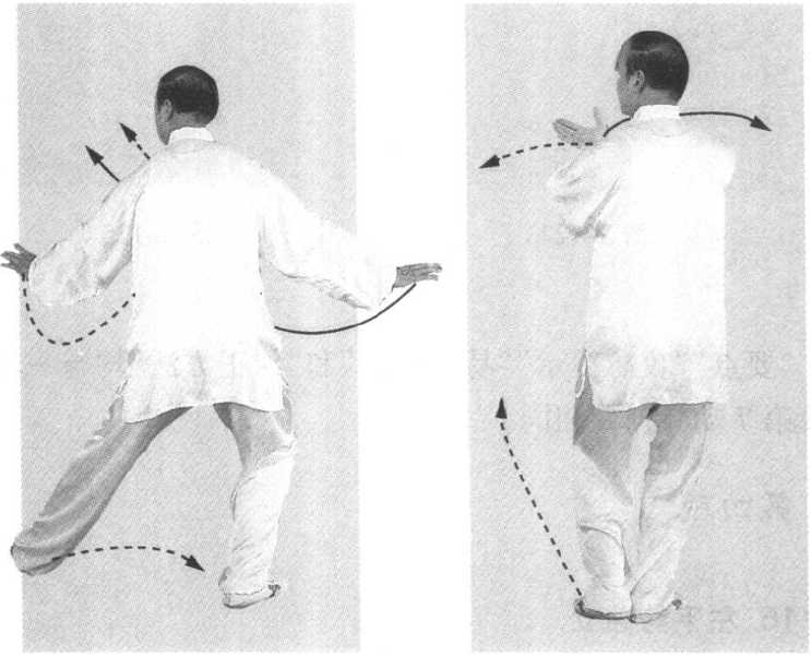 (2)身体重心再移至右腿,左脚收至右脚内侧,脚前掌点 地;同时两手由外圈向里圈划弧合抱于胸前,左手在外,手心 均向后。眼先随左手后平视左方(图3-122、图3-123)。
