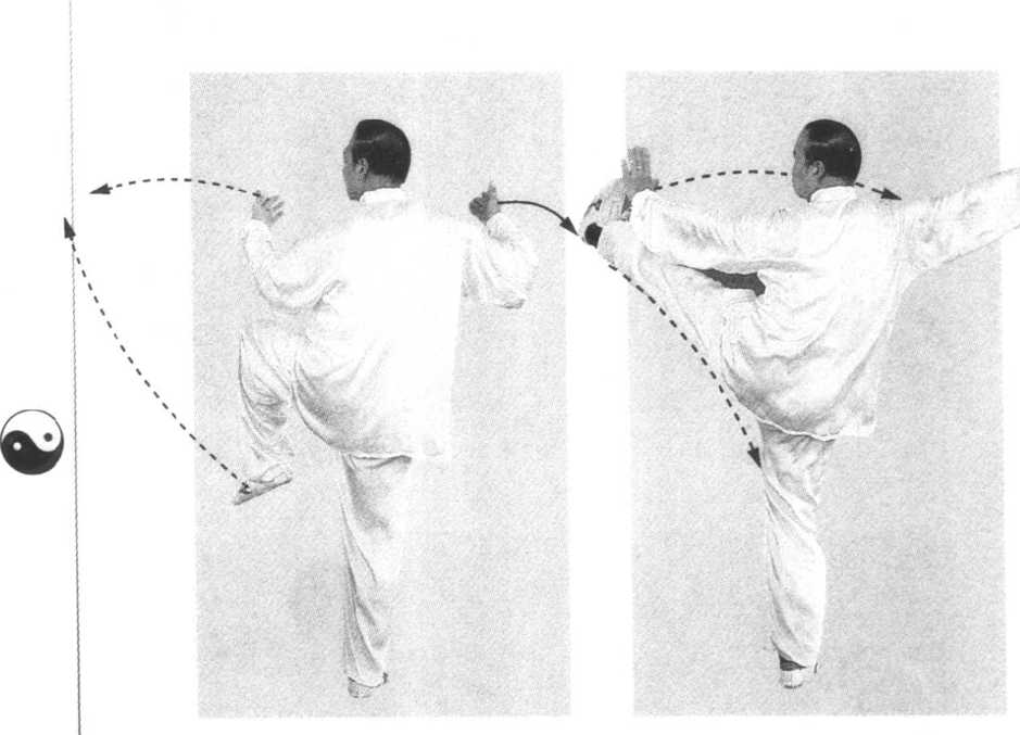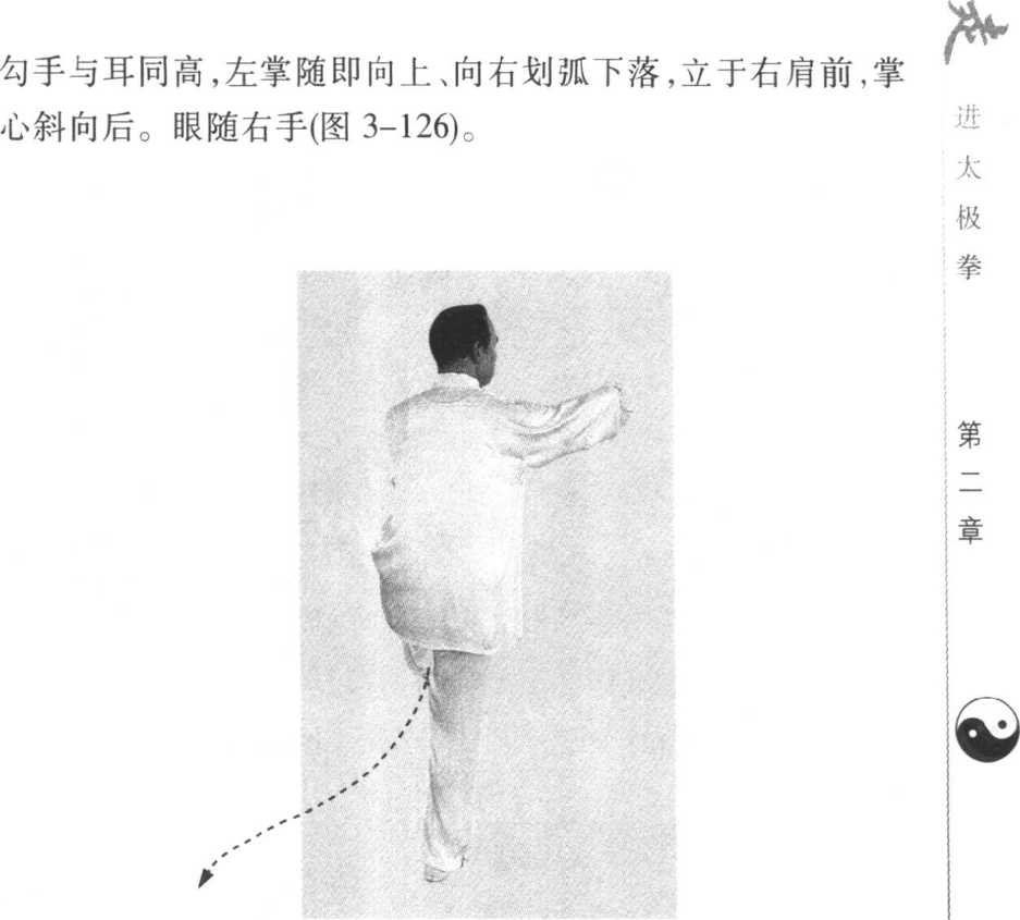 ⑴左腿收回平屈,上体右转;右掌变成勾手,举于右侧方,