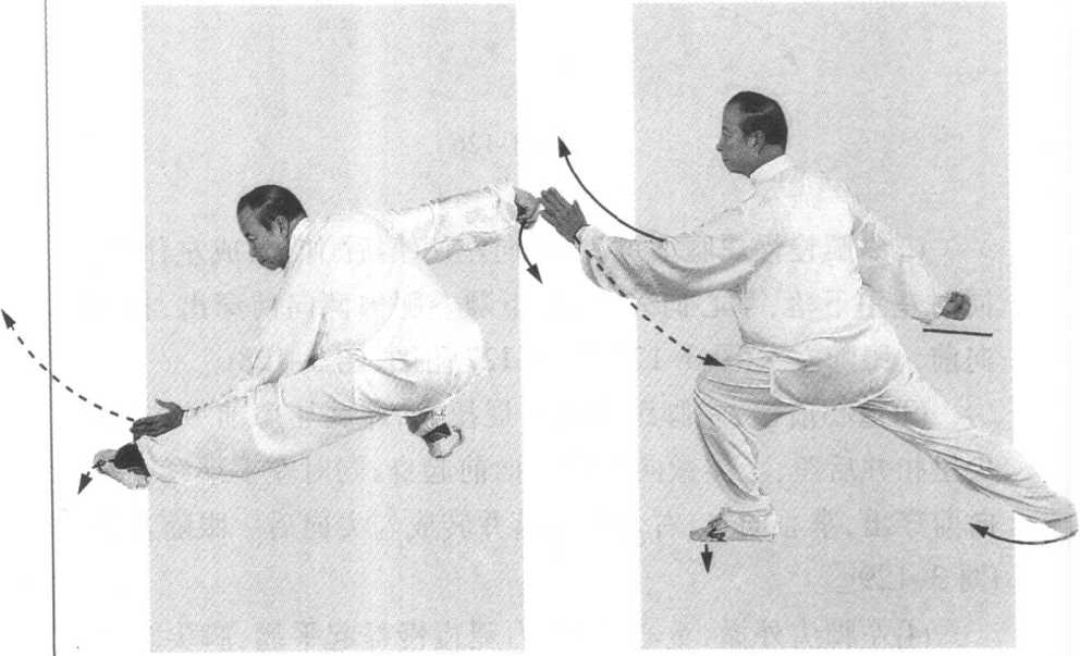 对手如右拳向我击来,我则向右闪身并左仆步以闪躲之,