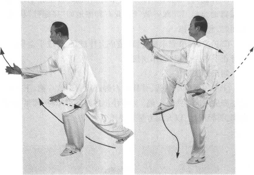 仆步前,左脚收至右脚内侧,脚前掌可不点地,也可点地。 仆步时,左脚尖与右脚跟须踏在一条中轴线上;穿掌时,上体 可微前倾,以助其势,但不可过倾而凸臀。右腿屈膝提起须与 右手挑掌协调一致,并肘与膝相对,“相系相吸”,好比右手能 将右膝牵拉起似的。