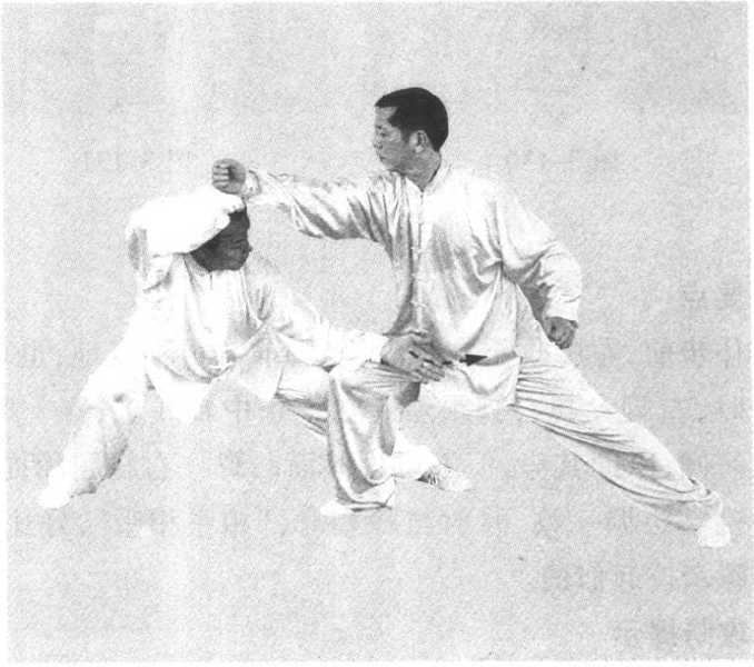 同时左手下穿挑击其裆部(图3-132);对手若退步防守,我则 ?进 随即右提膝,以膝部顶击对手裆部,以右拳同时挑击其胸腹 太 部。上下齐攻(图3-133)。