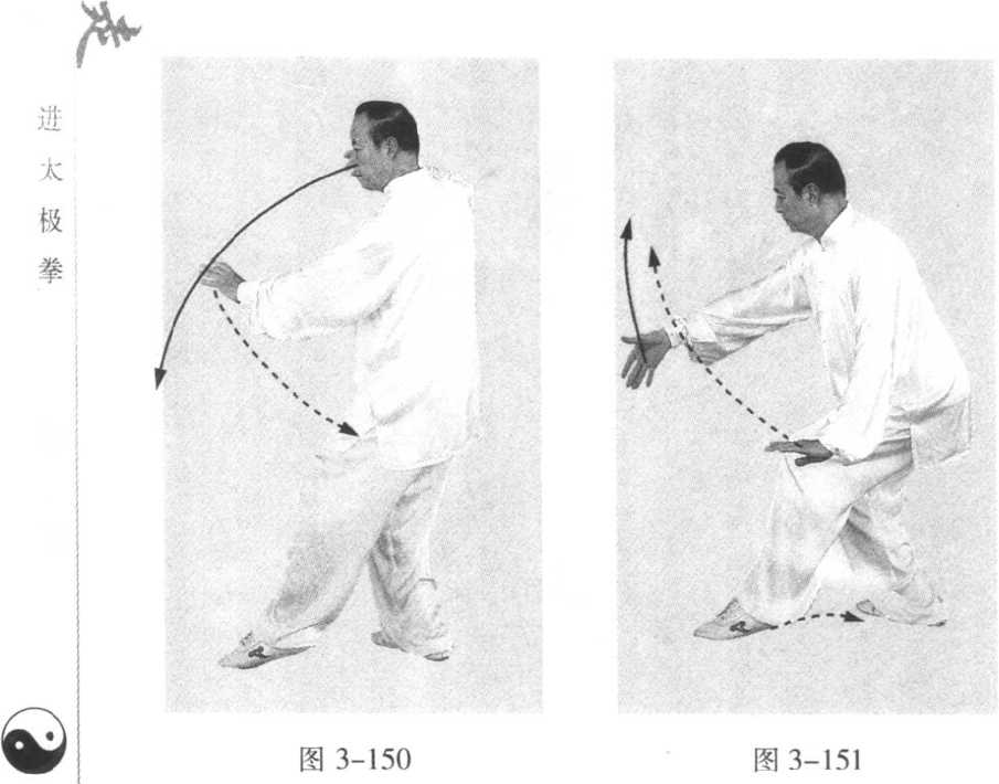 身体重心前移,右脚向前跟进半步,随即身体后坐,重心 再移至右腿,左脚稍前移,膝部微屈,脚前掌点地,成左虚步; 同时身体稍右转,右手下落经体前向后、向上提抽至右肩上耳 旁,随即上体左转,右掌由右耳旁斜向前下方插出,掌心向左, 指尖斜向下;左手从腹前向前、向左划弧落于左胯旁,手心向 下,指尖向前。眼先随右手再转随前下方(图3-150.图3-151)。