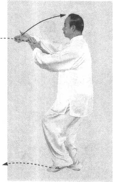 身体稍向右转,左脚提起经右腿内侧向前迈出,脚跟先着
