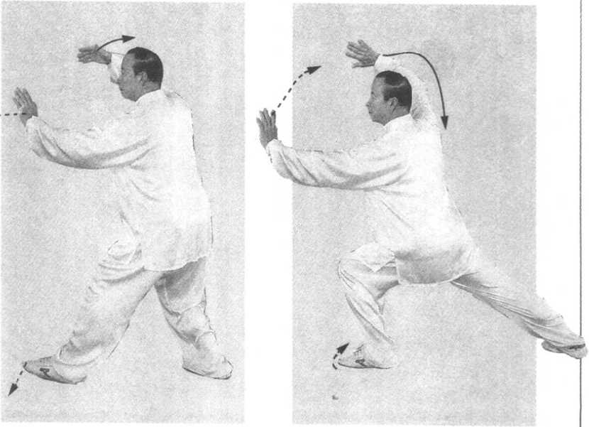 地,再踏实屈膝前弓,右腿自然伸直成左弓步;同时右手由体 前上提,边翻转边屈臂上举,撑架于右额前上方,手心斜向上, 左手经胸前上提至右腕内侧下方再向前推出,掌心向前,手指 朝上,高与鼻平C眼通过左手前视(图3-152.图3-153)。