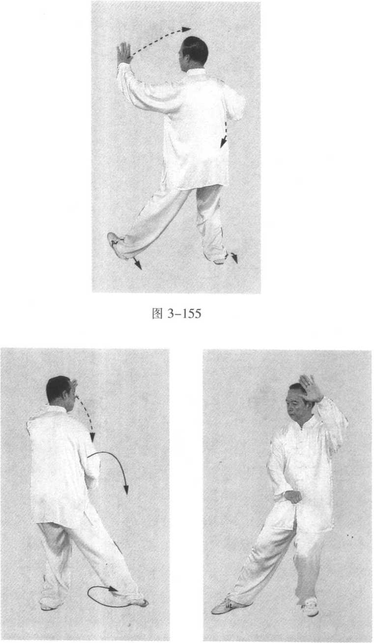 ⑴上体后坐,重心移至右腿,左脚尖里扣,身体向右后转, 随即身体重心再移至左腿;同时,右手随转体向右、向下变拳 经腹前划弧至左肋旁,拳心向下;左掌划弧上举于头前,掌心 斜向上。眼先随右手后视前方(图3-155、图3-156、图3-156 附图)。