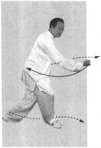 (2) 上体右转,右脚提起经左脚内侧向右前方迈出,脚跟着 地,脚尖外撇;同时右拳经胸前向前翻转撇出,拳心向上;左手 下落按于左胯旁,掌心向下,指尖向前。眼随右拳(图3-157)。