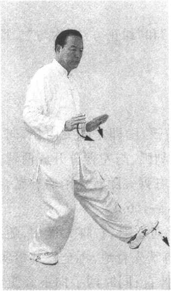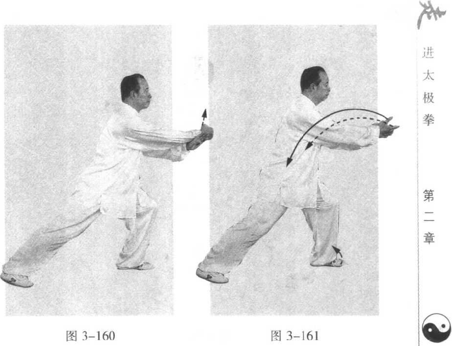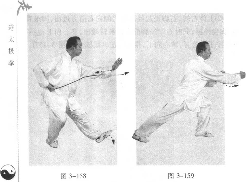 (3) ,随后全脚踏实, 左腿屈膝以脚前掌蹬碾地面,左脚向前迈步,脚跟着地;同时 左掌随左臂内旋向右弧形拦出,掌心向右;右拳先向内翻转下 落,至身体右侧时再向外翻转划弧收至右腰旁,拳心向上。眼 随左手(图3-158)。