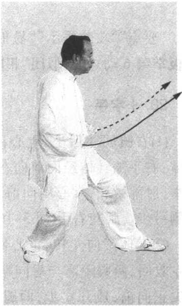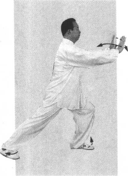 ⑵左脚掌踏实,左腿屈膝前弓,右腿自然伸直成左弓步; 同时两手翻掌收至两肋前,再向下经腹前向上、向前推出,腕 与肩部同高、同宽,掌心向前,掌指向上。眼通过手视前方(图 3—163、图 3-164)。