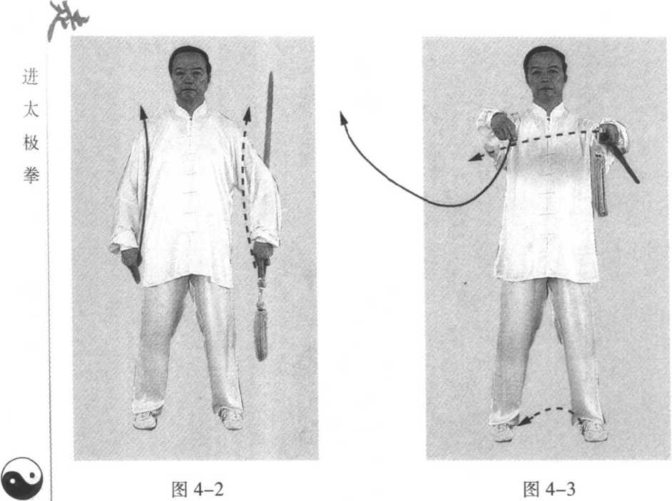 弧举于身体右刖方,手指同耳fwj ,手心朝左后方;左手持剑向 右划弧屈臂于右胸前,剑在左臂下方,剑尖微斜向下。眼随右 手(图4-4) o