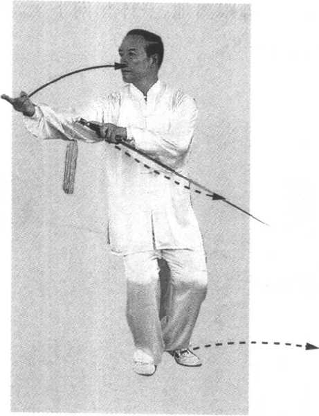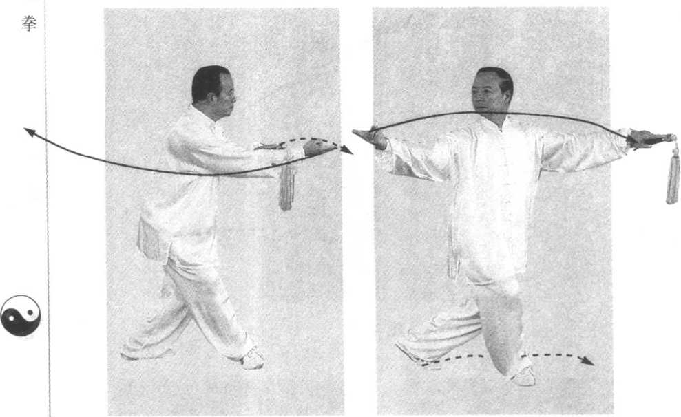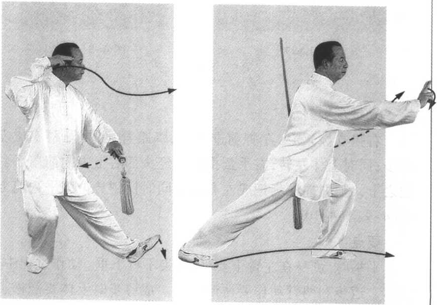 左臂屈肘,剑柄向右前臂上方穿出,右手剑指外旋,并慢 慢划弧下落撤至右后方,手心向上,两臂前后展平;同时右腿 提起向前盖步横落,脚尖外撇,两腿交叉,上体右转,重心移于
