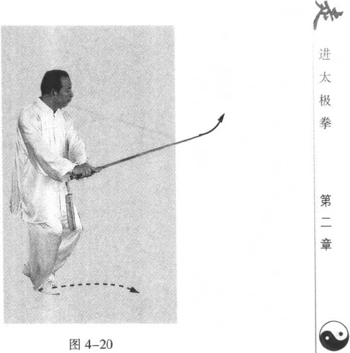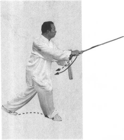 右摆脚与剑前伸须同时,右移重心与内旋回带须同时,再 右转体与提收左脚须同时。做好这三个“同时”,整个动作就协 调一致了。