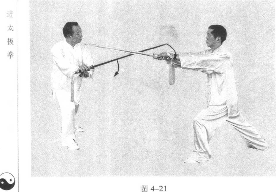 (2) 让对手用剑向我右胸部刺来,我则右带剑以化开。师友 可帮其摆好位置,使剑尖略高于手,并使剑尖指向对手胸部 (图 4-21)。