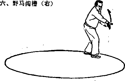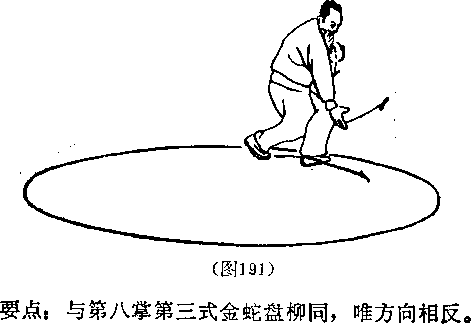 左足尖外展,上身随之左转向东,两腿交叉,屈膝略 蹲;右掌同时向左下方直臂伸出,掌心向左,掌指向下;左 掌随之由前向右上方屈肘挑起,停于右耳旁,掌心向右,掌 指向上I眼向东南方下视(图191)。(图m)右足向东南方前进一步,上身后坐,右掌同时向东南方 直臂前撩,栂指外侧向上*左掌同时从右耳旁落下,置于左 腰侧,拇指在后,其余四指在前,成俯掌;眼看右掌(图192)* 要点:与第八掌第四式野马闯槽同,唯方向相反。
