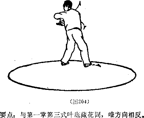 右足向左足前方迈进一步,足尖里扣》两腿微屈,上身 转朝向北方;左掌同时臂内旋使拇指外侧向下,屈肘向左平 带;右掌随之臂外旋使掌心向上,向左腋下穿出(图204)。
