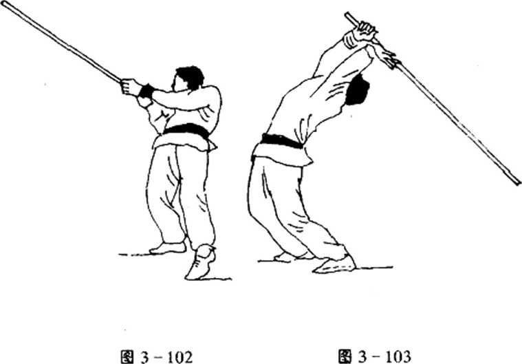 重心前移,体微左前倾左 手同时向上、向后、再向下握棍滑把,使棍身斜横于体前。目 斜视前方(图3 - 100)o