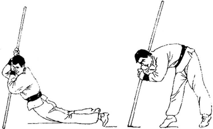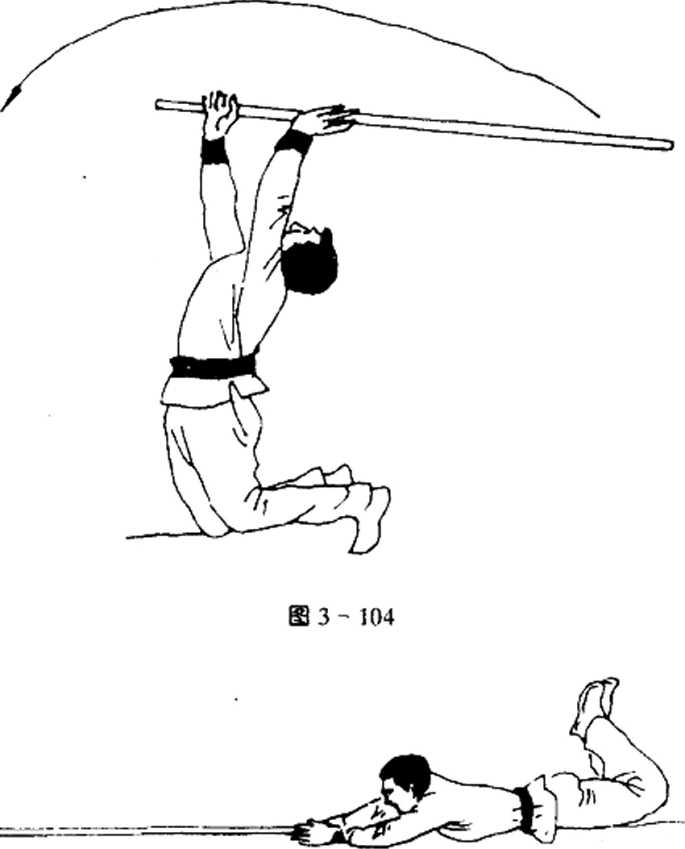 双手交替换把.以棍支撑身体向上浸慢橡起,身体后虬 将双腿前拖,目飘视地面(图3 - 108)。