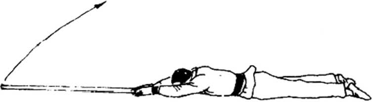 重心略左移,骸向正前方顶出身体后仰,双手持棍先于空 中画一小圈,按照向下、向右、再向上的次序画,然后向头顶上