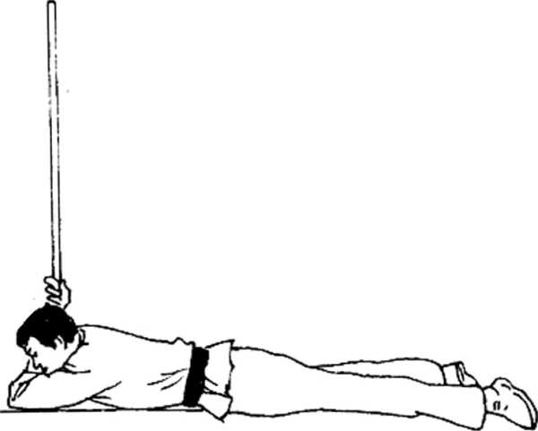 双手屈肘(图3-107),慢慢将棍竖于头部右侧,抬头。