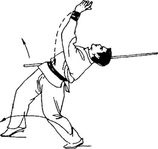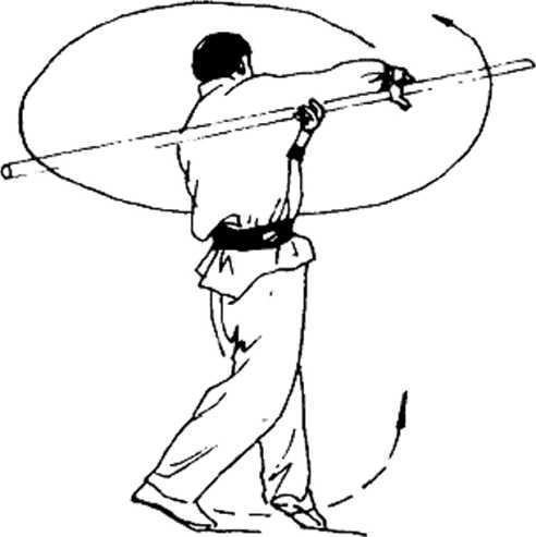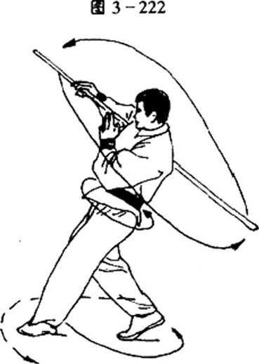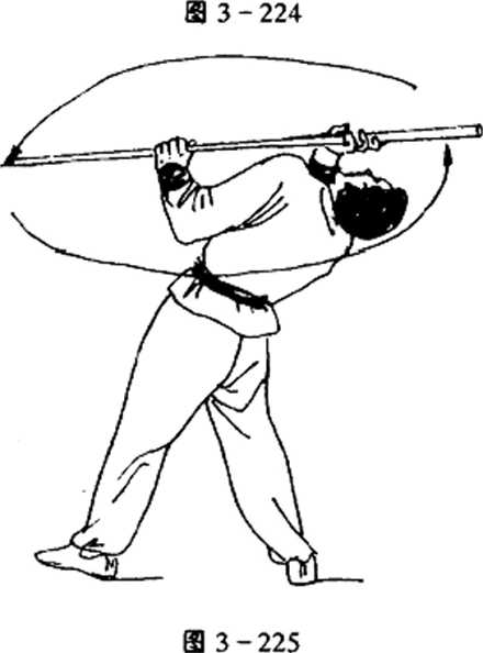 如图3 -225所示,右脚向前进一步,脚尖内扣45度,身 体向左拧转,同时右手向左、向后、再向右前,左手当右手向后 时向前,右手向右前时向左后运动,使棍尾向左、向后、再向右 前,根头向右后、向前、再向左过头部平行于地面画一圆形。 目仰上视(图3-225)。