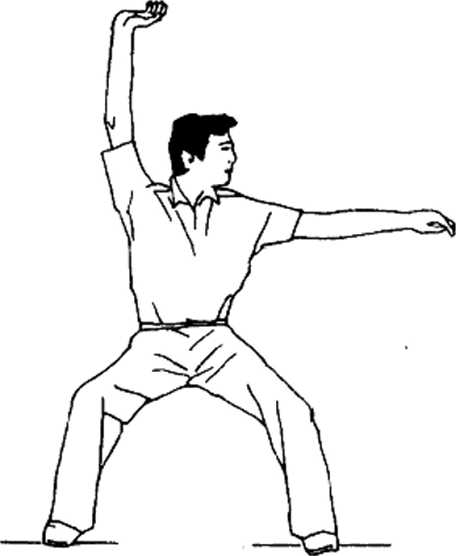再开成八字,再反复一遍,两脚间距即达到马步开合的要求 To这时,双膝弯屈,身体正直地下蹲至膝面与地成水平。双 脚尖内扣,两膝外分,右手架掌于右耳侧后,左手握拳平伸,顶 头,挺胸,收臀,目视左侧方。