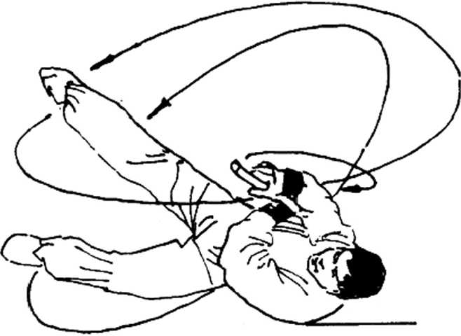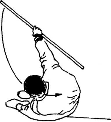 身体向上撑起,上身向左拧转,右手握棍准备扫击对方。上动不停,身体向前、向左、向后云腰下倒,右手持棍由后 向前、向左平挥。目视棍头(图3-241>。图 3-241ffi 3 - 242接上动,如图3 - 242所示,身体继续后倒,右手持棍向 左、向上扫击,当棍头扫过身体以后,右腿随即向左、向上踢 击,准备云腿。目视左上方。