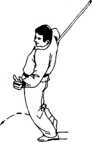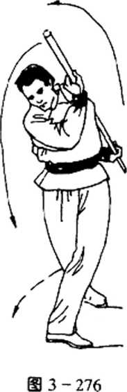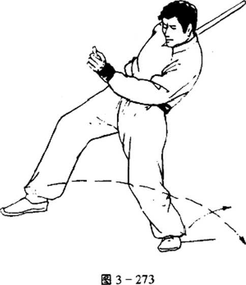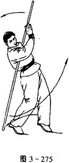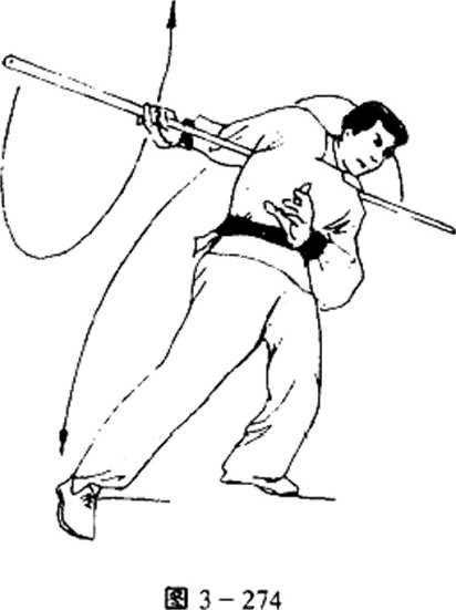 演练者左脚向右上一步,身体右后转,左手持棍向下、向 后运动,使棍尾向下向后,棍头向后向上随体转运行。左手持 杯式左前指。目斜视左前方(图3 - 272)。上动不停,如图3 - 273所示、身体微向左转,右脚向前翘 起,准备向左后盖步,左手持杯前摆,目视杯口。接上动,右脚向左后落步(图3-274),左脚随退一步,体 左后仰,魏略右前顶,目斜视右前方。图 3-272