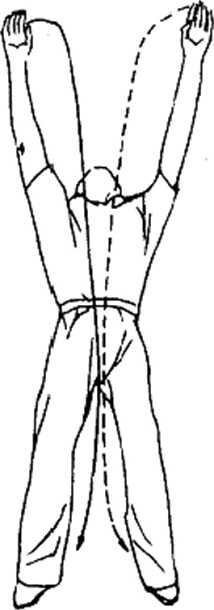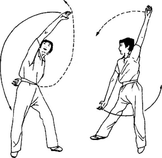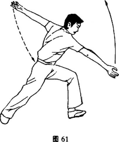 右手向下、向左前方,左手向上、向右后方抡转。身体立 起做关节向左后旋转,呈左弓步状(图61)示。